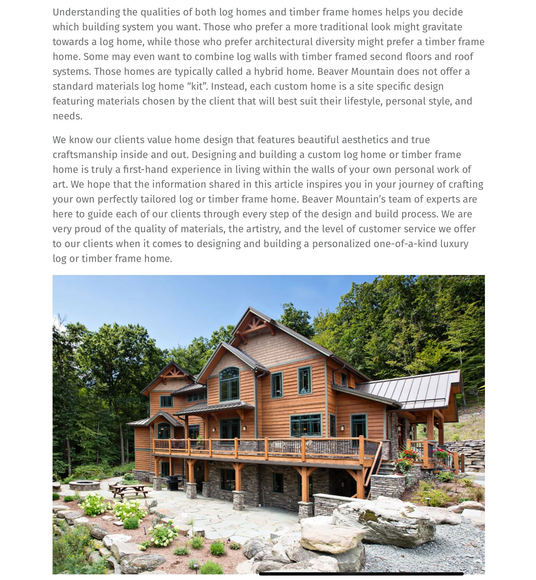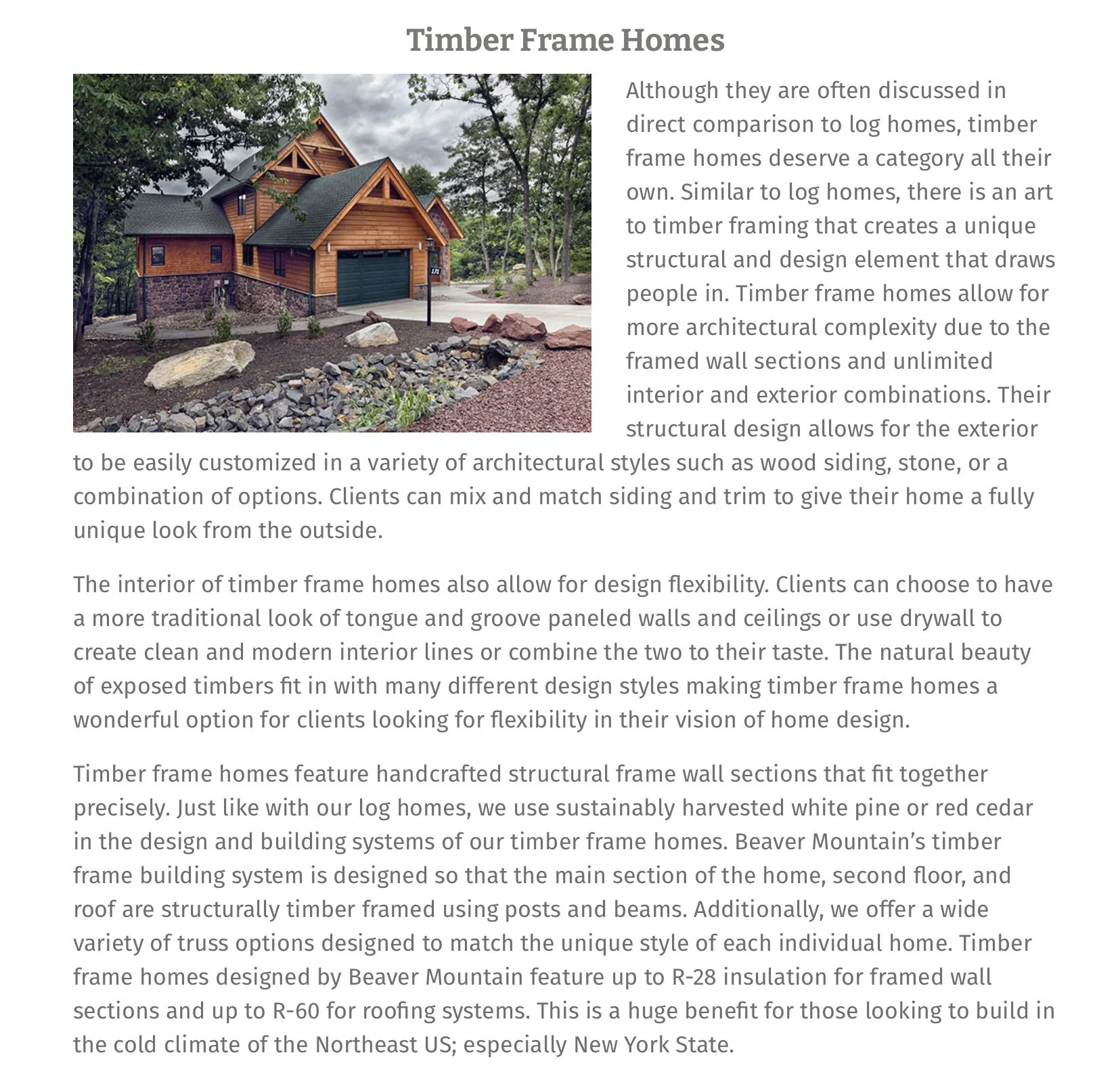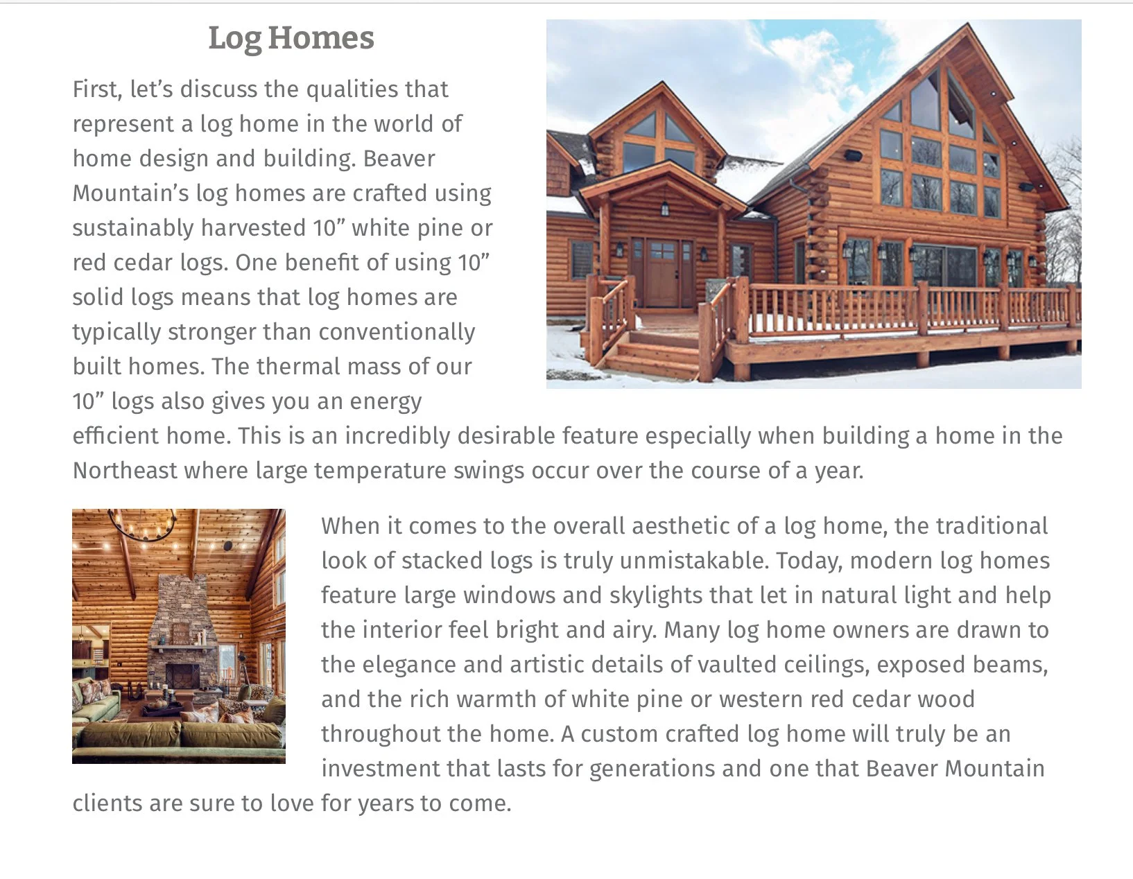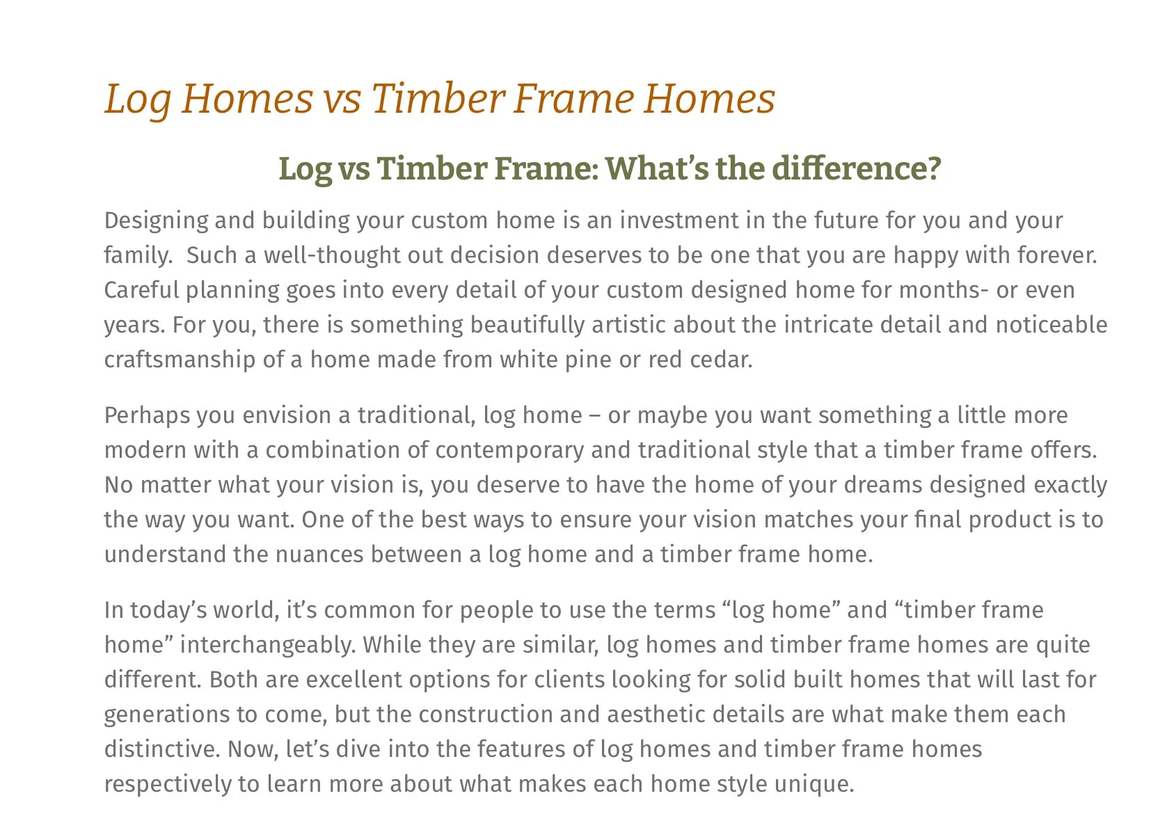 Overview: I researched the topic and gathered resources provided by the client on the differences between log and timber frame home styles (via websites, magazine articles, and industry brochures). I took the knowledge I acquired and translated it into an easy to read article that would inform their audience-as well as keep the audience engaged throughout the piece.