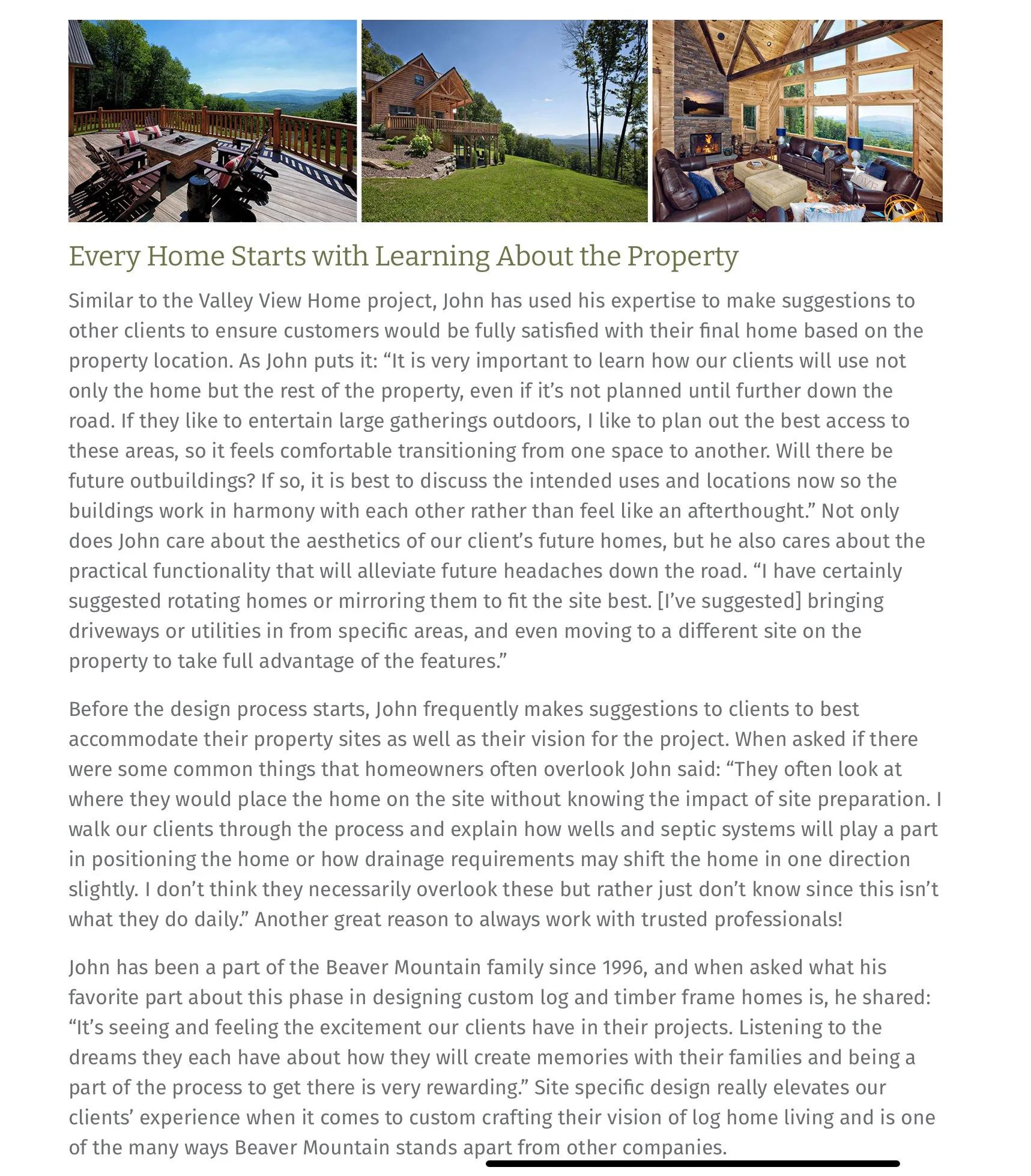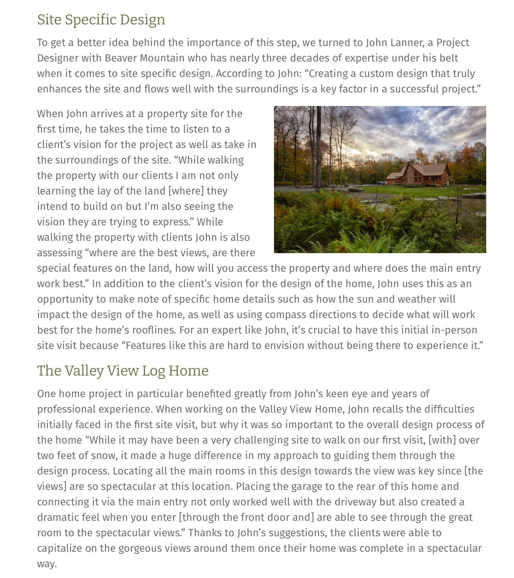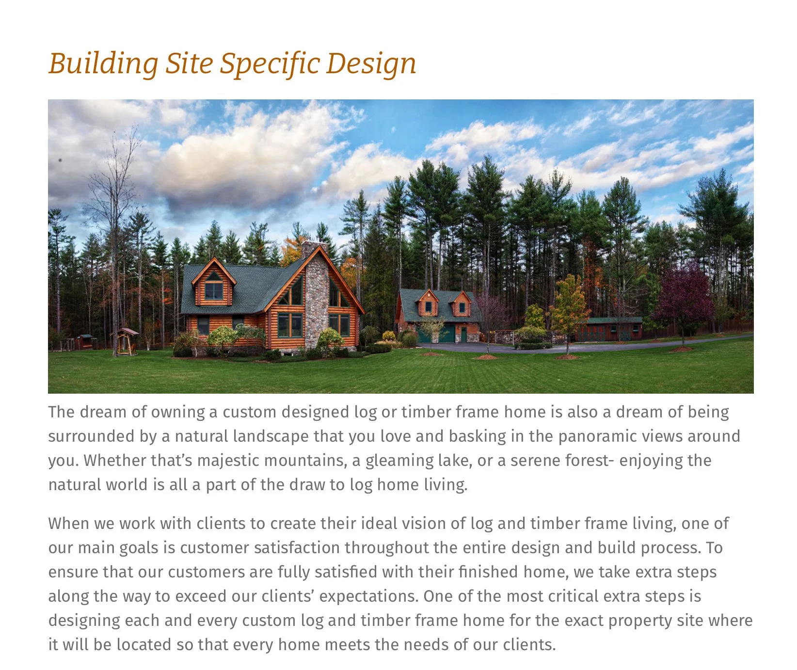 Objective: To create an easy to read article explaining the benefits and process of site-specific design when it comes to log and timber frame homes.